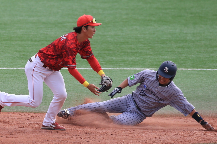 | 〈 日本生命 vs パナソニック 〉 日本選手権出場枠第一代表決定戦がわかさ球場で行われた。 初回2回と連続のピンチを切り抜けた日生は7回を3回まで無安打の日生打線、 二巡目に入るとパナソニック先発吉川を捉えだした。 4回相手エラーの走者を5番SS山本がライト線へタイムリーツーベースで先制。 次の回、籾山・神里の連打から2番LF皆川が右中間スタンドへスリーラン。 本田-清水-藤井の完封リレーで、日生6年連続34回目の出場決定。 |