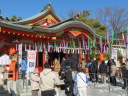 | 明けましておめでとう御座います !! 本年もよろしくお付き合い下さい !! 今年も生駒山上から昇る初日の出を撮りましたがコンデジですからこんなものでしょうかね。 初詣は近くの片山神社へ早目に出掛けました。 例年の様な長い行列にも出会わずに、拍子抜けする位、スムーズに社殿へ到着。 お賽銭は一年間貯めていた硬貨にしてます。 それを賽銭箱へ入れる時の音が周囲から注目されます(笑) 本殿に向かって左横に毎年新聞の地方版の話題になる大きな干支の絵馬が据えられています。 この製作者は宮司さんの美大出の甥っ子さんとか。 また参道の入口には今まで気が付かなかったのか、かなり大きな門松が飾られていました。 |