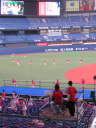 好カードが集中した今日四日目、JRの始発もいつもより明らかに一見して甲子園へ向かう 乗客が多い。阪神は幸いに臨時電車に間にあったので楽に座れた。 昨日からは避難席と称して屋根下をキープし休む。 |