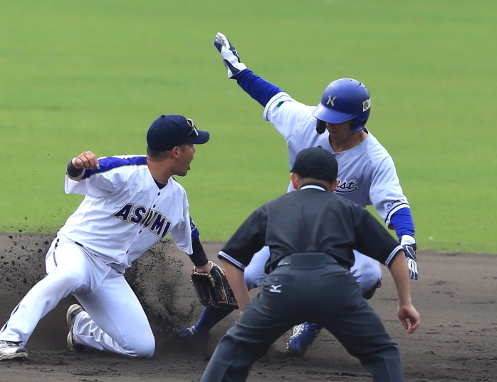 | 7回表まで緊迫した投手戦が続いたが、その裏の日生攻撃1死1.2塁に、PH高橋の 中前ヒット性の打球をSSが好捕併殺?、ところが高橋のヘッスラと送球が逸れる間に 二塁ランナーのヴィットルが好走良くホームイン。8回には3番3B原田が二塁打、 4番7F越智の内野ゴロで三進、PH籾山のスクイズBが決まり貴重な追加点。 先発阿部が8回を零封、最終回は清水、藤井の鉄壁リレーで完封勝利、準決へ。 |